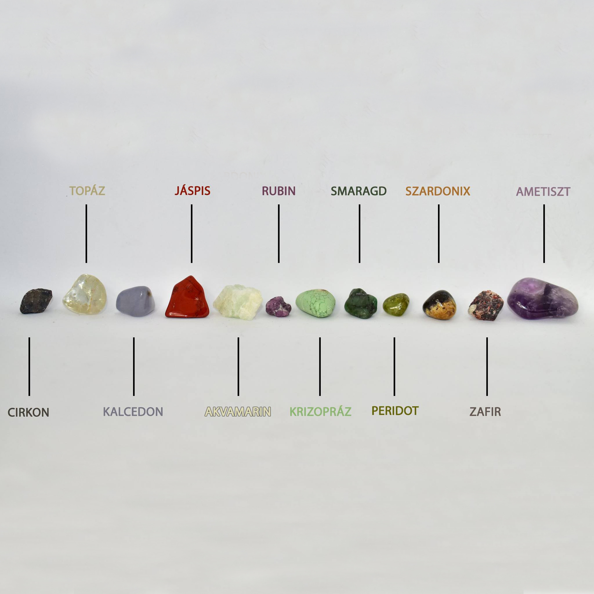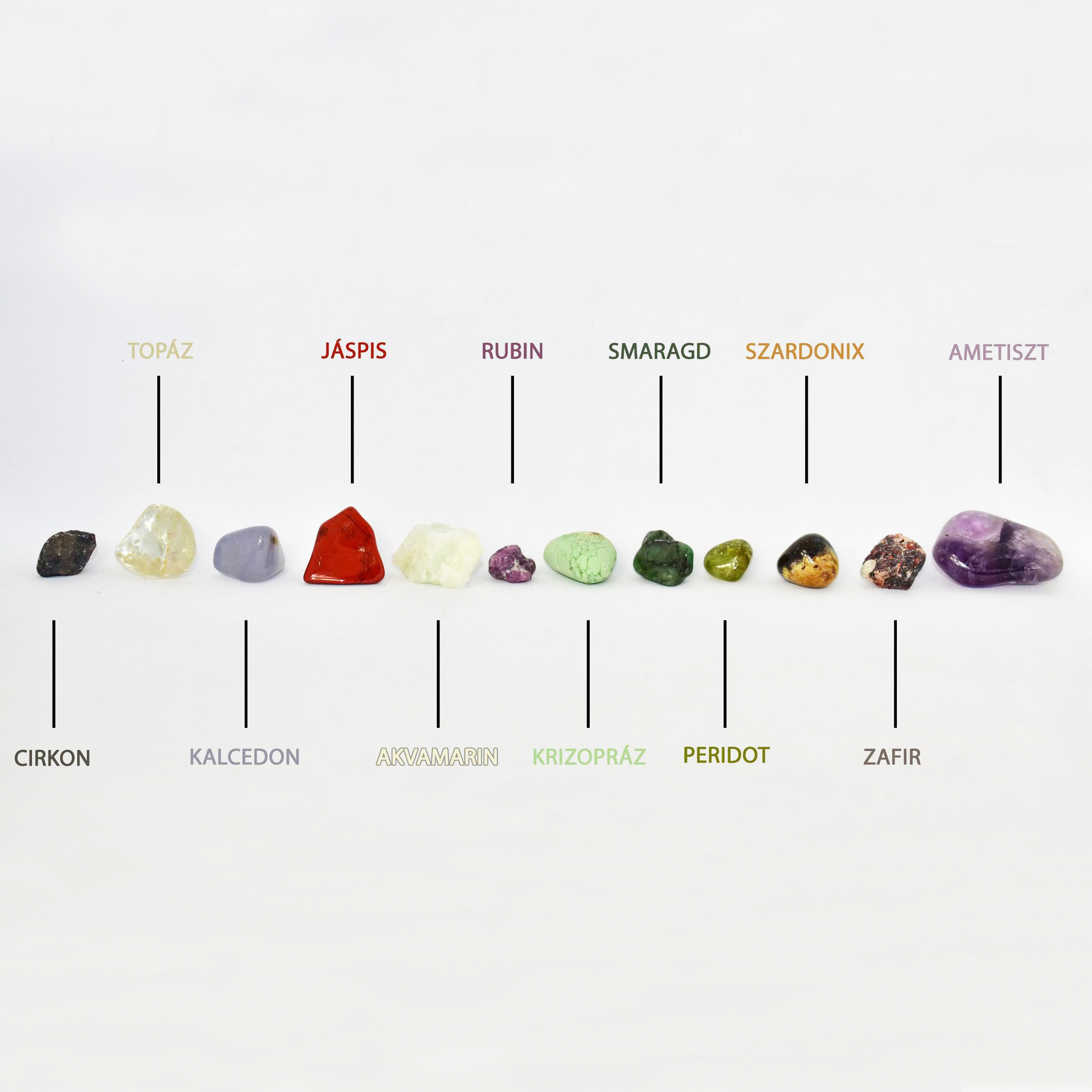Cirkon, Topáz, Kalcedon, Jáspis, Akvamarin, Rubin, Krizopráz, Smaragd, Peridot, Szardonix, Zafír, Ametiszt